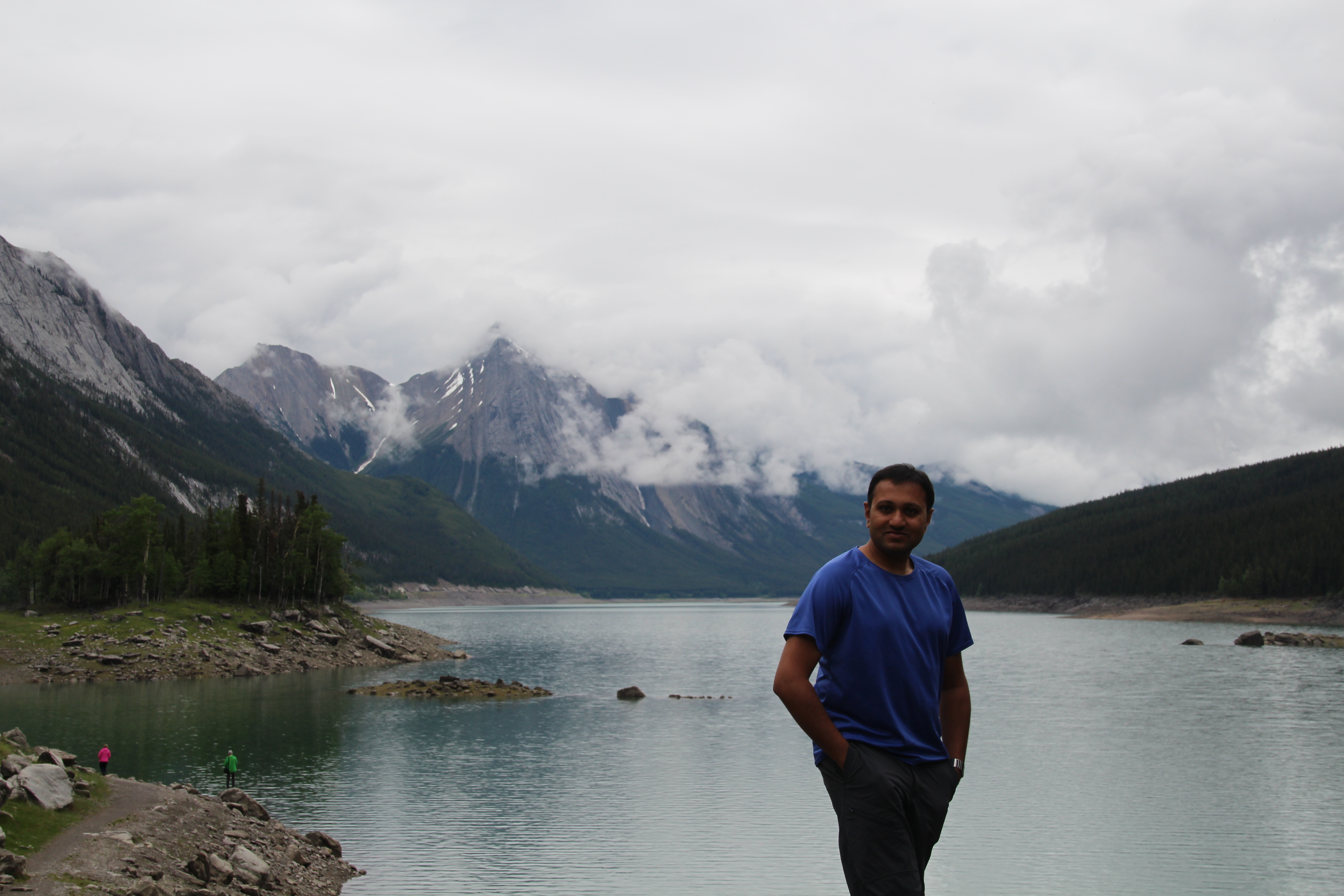 From there we carried on, on the Malign lake road towards the lake, where on the way we had to stop for a photo – though far away it was a moose. We stopped at the Medicine Lake next which already had a few people stopped, taking photos. With the cloud cover the lake looked quite dull, but the mountain backdrops were still quite cool. The lake is not actually a lake, but part of the malign river backing up, so its level changes alot over the year.