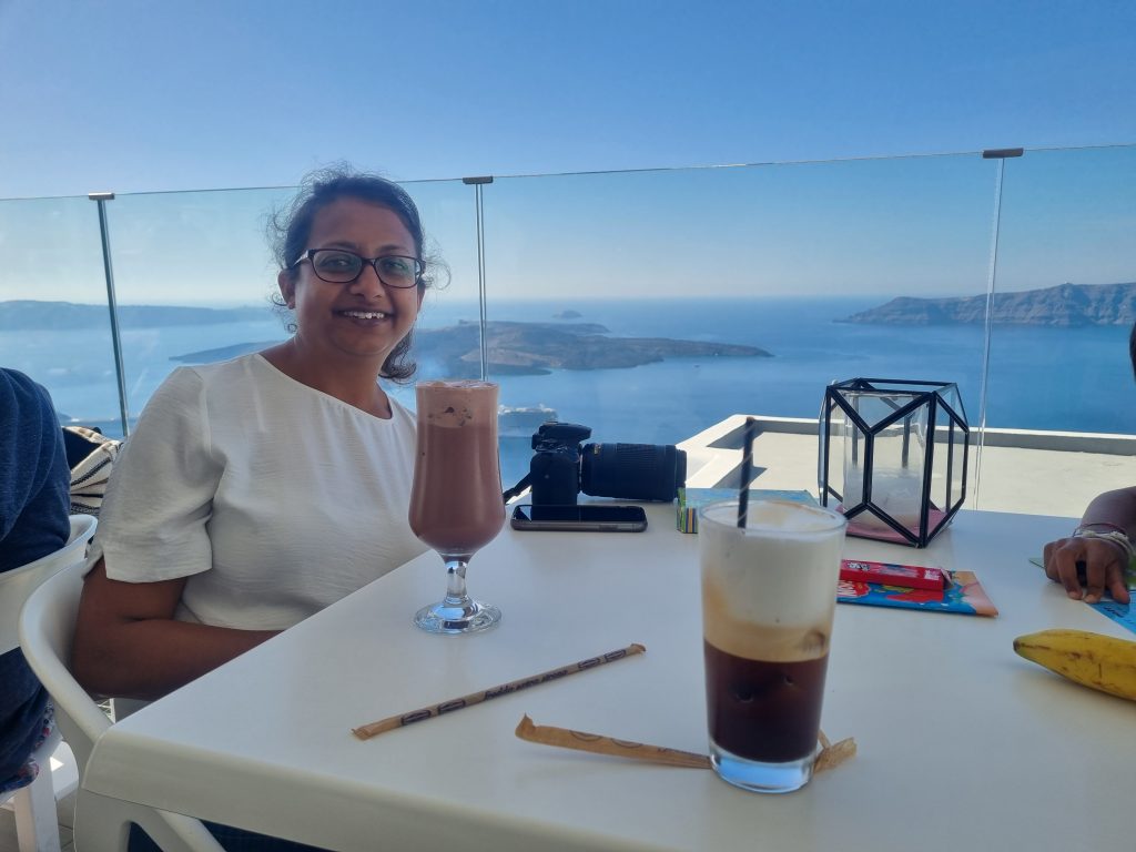 En route back we stopped about half way as it was approaching 1pm at a cafe called Onar, where I had a coffee and Bhavni/Airyen had a chocolate milkshake. I was right on the cliff face with a beautiful view over the caldera. With us being fed and watered it was soon time to carry on the amazing walk until we got to the car.